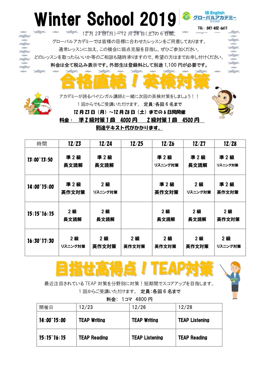 12月27日(木)~1月3日(木)までは誠に勝手ながら、休校日とさせて頂きます。また、1月4日(金)は13:00~の営業となります。その間のお問い合わせについては、休校日開けから順に追ってご連絡させて頂きます。よろしくお願い申し上げます。