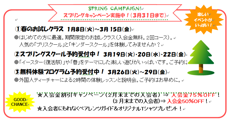 2019年1月8日(火)~3月15日(金)までプリスクールのキャンぺーンが始まります。お得に習い事を始めるチャンスです。お早めにご予約下さい。